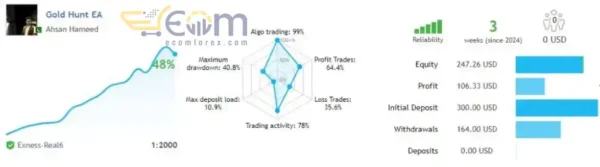 The Gold Hunt EA, managed by Ahsan Hameed on the Exness-Real6 platform with 1:2000 leverage, has shown a growth of 48% over a period of 3 weeks. The EA is heavily automated, with 99% algo trading activity and a relatively high trading activity rate of 78%.