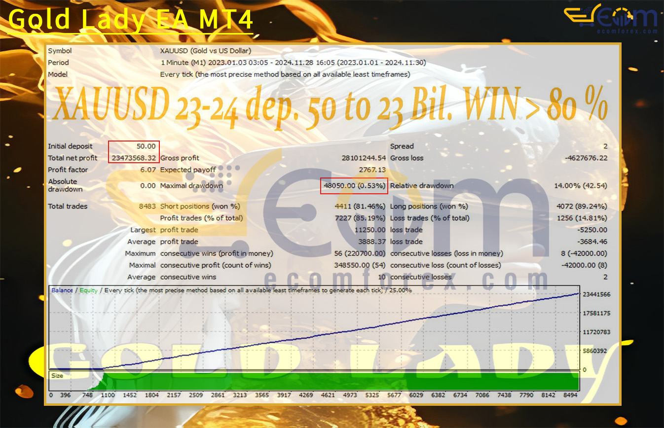 The Gold Lady EA demonstrates strong long-term profitability and consistent performance, reflecting an effective balance between growth and disciplined risk management. In this backtest, starting from a modest $50 deposit, the EA generated extraordinary returns, maintaining a steadily rising equity curve with controlled drawdowns.