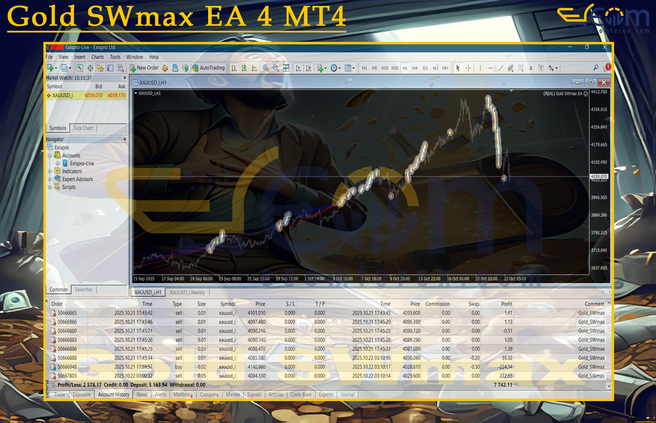 Gold SWmax EA has demonstrated verified live trading performance on a real Exispro-Live account, fully tracked and confirmed on the MQL5 Signal platform for over 21 weeks.