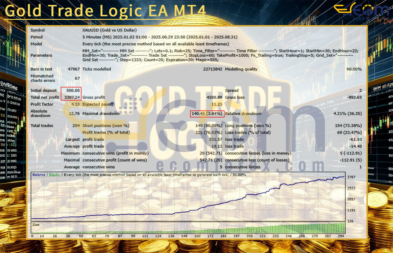 The Gold Trade Logic EA demonstrates consistent profitability and disciplined execution, reflecting a strong balance between growth and controlled drawdowns. In this backtest, starting from a modest $500 deposit, the EA generated impressive returns while maintaining a smooth upward equity curve and stable performance.