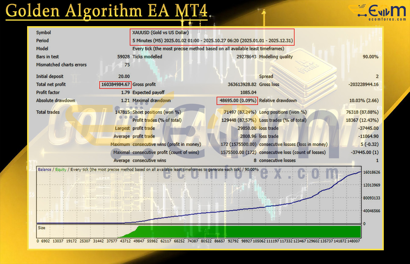 Golden Algorithm EA delivered exceptional long-term profitability in this intensive 2025 backtest on XAUUSD (Gold), transforming a minimal $20 starting balance into more than $160 million while maintaining a controlled drawdown and remarkably high trade accuracy.