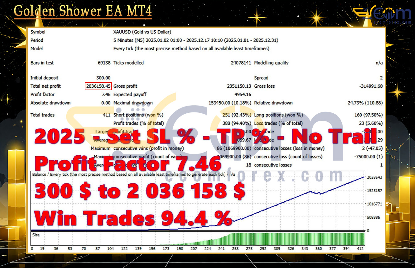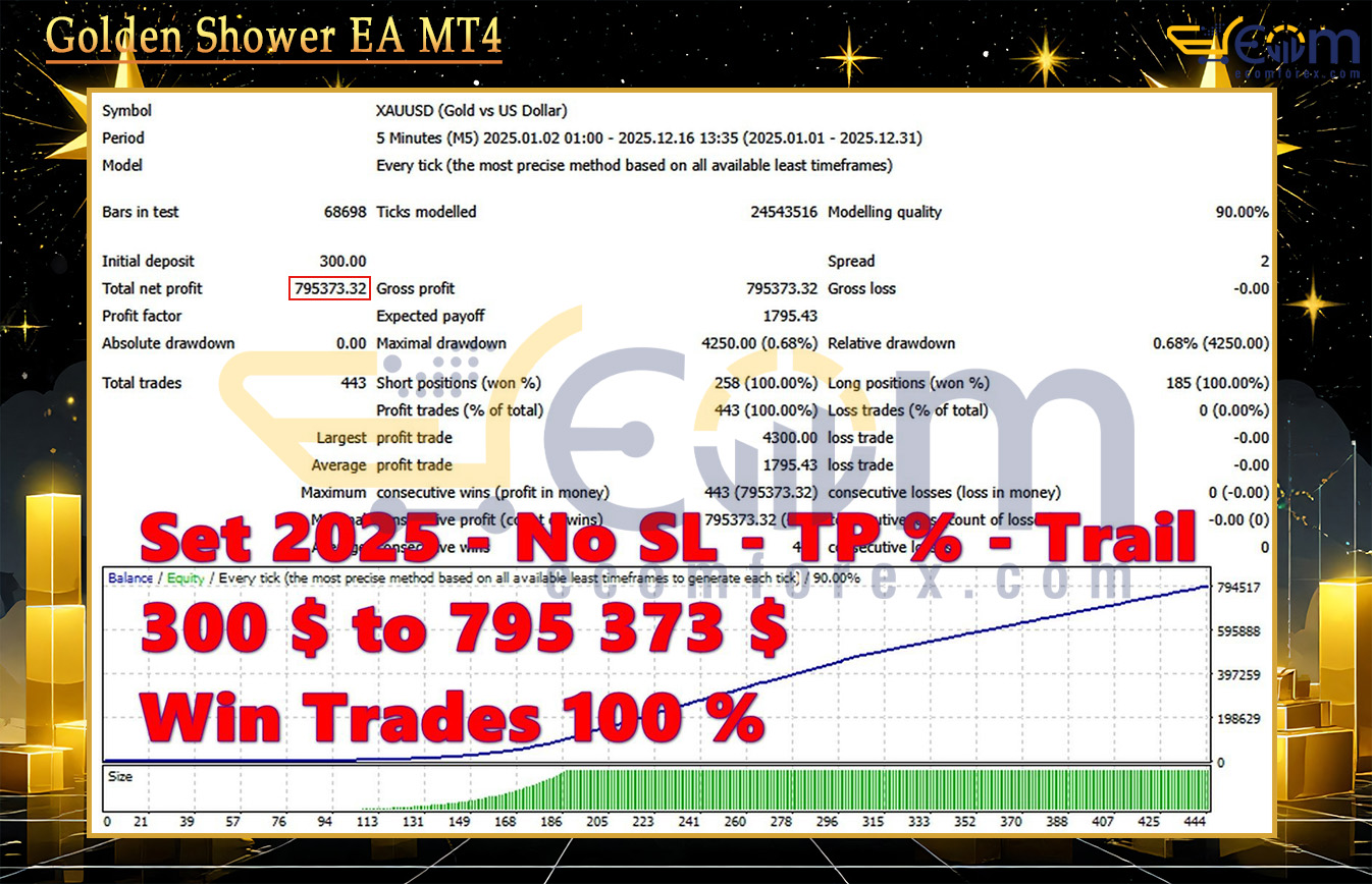 Golden Shower EA has delivered extraordinary profitability and impressive stability in this comprehensive backtest on XAUUSD (Gold) using the M5 timeframe.