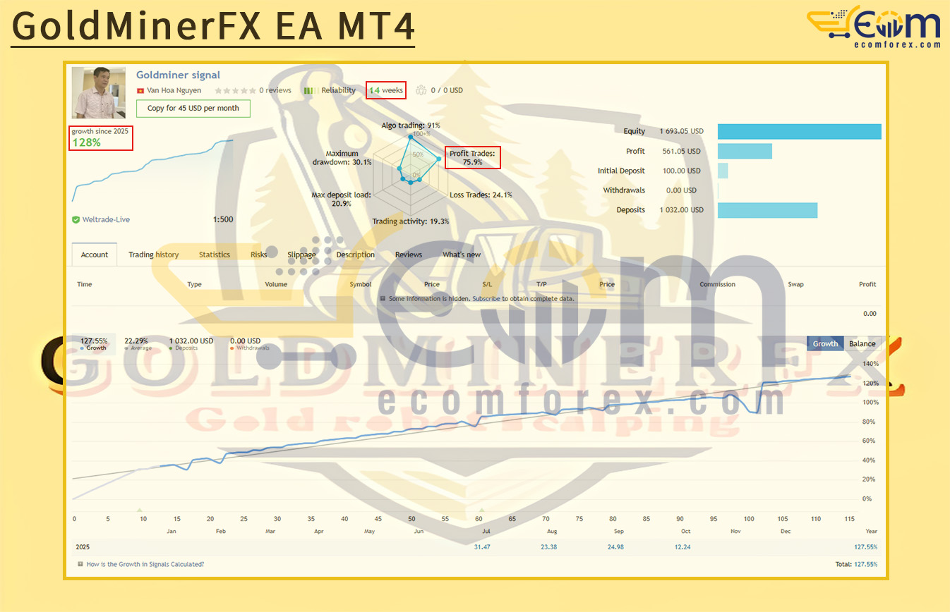 GoldMinerFX EA MT4 is a fully automated trading system designed exclusively for Gold (XAUUSD). Its real trading performance has been verified on live accounts, proving the EA’s capability to deliver consistent profits and disciplined risk control in real-market conditions.