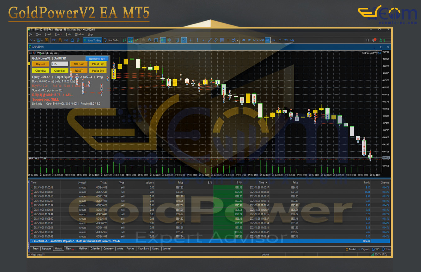 Gold PowerV2 EA MT5 follows the classic “trend is your friend” philosophy using RSI to identify momentum direction, then enters via smart limit orders (buy/sell limits) to catch pullbacks in the trend — a proven, low-aggression style that avoids fighting the market. The standout feature is its Percentage Profit Reset: once equity hits your chosen profit target (1%–1000%), the Expert Advisor (EA) automatically closes everything, books the gain, and restarts fresh — enforcing disciplined profit-taking and preventing overexposure during euphoria.