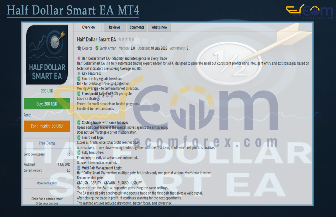 Half Dollar Smart EA MT4 is a conservative, low-volatility automated trading system that focuses on micro-profit cycles rather than chasing big wins. It combines classic technical indicators — Moving Average for trend confirmation and RSI for momentum/overbought-oversold filtering — to identify high-probability entries.