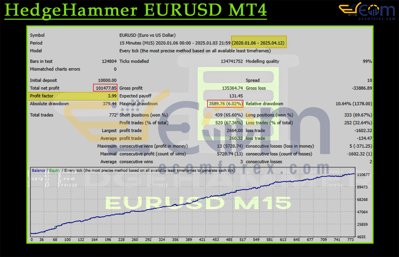 Hedgehammer EA has demonstrated powerful profitability and consistent stability over a 5-year backtest on EURUSD (M15 timeframe).