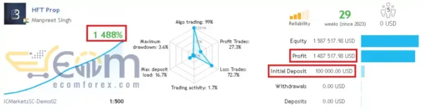 The HFT Prop trading system, managed by Manpreet Singh, has demonstrated exceptional performance over a period of 29 weeks. Starting with an initial deposit of $100,000, it has achieved an impressive profit of $1,487,517.98, marking a remarkable growth rate of 1,488%. The system operates with a high level of algorithmic trading (99%) while maintaining a maximum drawdown of just 3.6%, indicating a balanced risk approach. Despite a low profit trade ratio of 27.3%, it compensates with consistent high-frequency trading, leveraging a max deposit load of 16.7%. This setup highlights its effectiveness in managing risk while generating substantial returns.