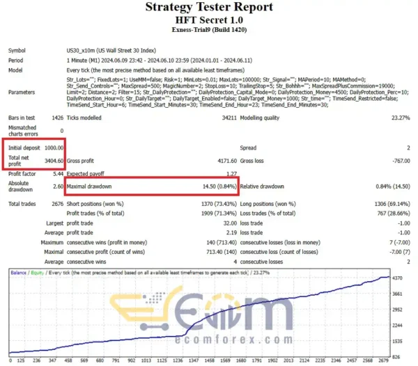The HFT Secret 1.0 is an automated trading system designed for the US30_x10m (US Wall Street 30 Index) on the MetaTrader 5 (MT5) platform. This backtest covers a period from January 1, 2024, to June 11, 2024, with a 1-minute (M1) timeframe.