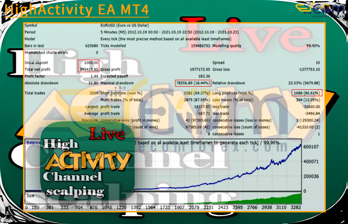 The HighActivity EA MT4 has delivered impressive results in long-term backtesting, showcasing its ability to achieve consistent profitability with disciplined trade management. Over the 8.5-year period (2012–2021, EURUSD, M5 timeframe), the system demonstrated strong growth while maintaining controlled drawdowns, making it a robust choice for traders seeking sustainable performance.