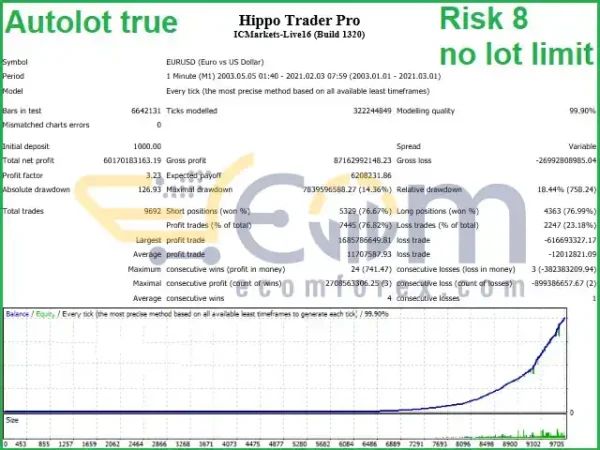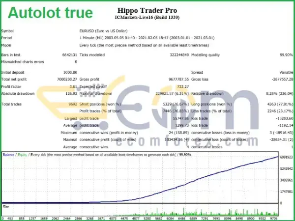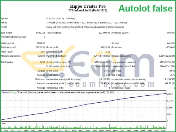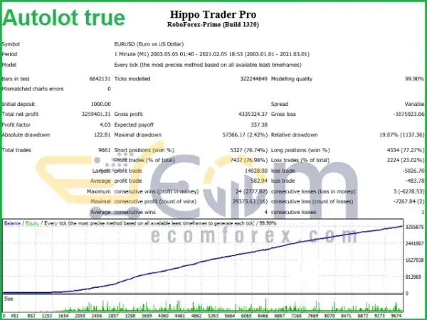 Backtest results for the Hippo Trader Pro EA from the years 2021 to 2023, starting with a capital of $1000, exhibit outstanding performance. The cumulative profit totals $6.6 million with a maximum drawdown of merely 2.42%. These findings illustrate remarkable profit viability and the potential for substantial earnings.