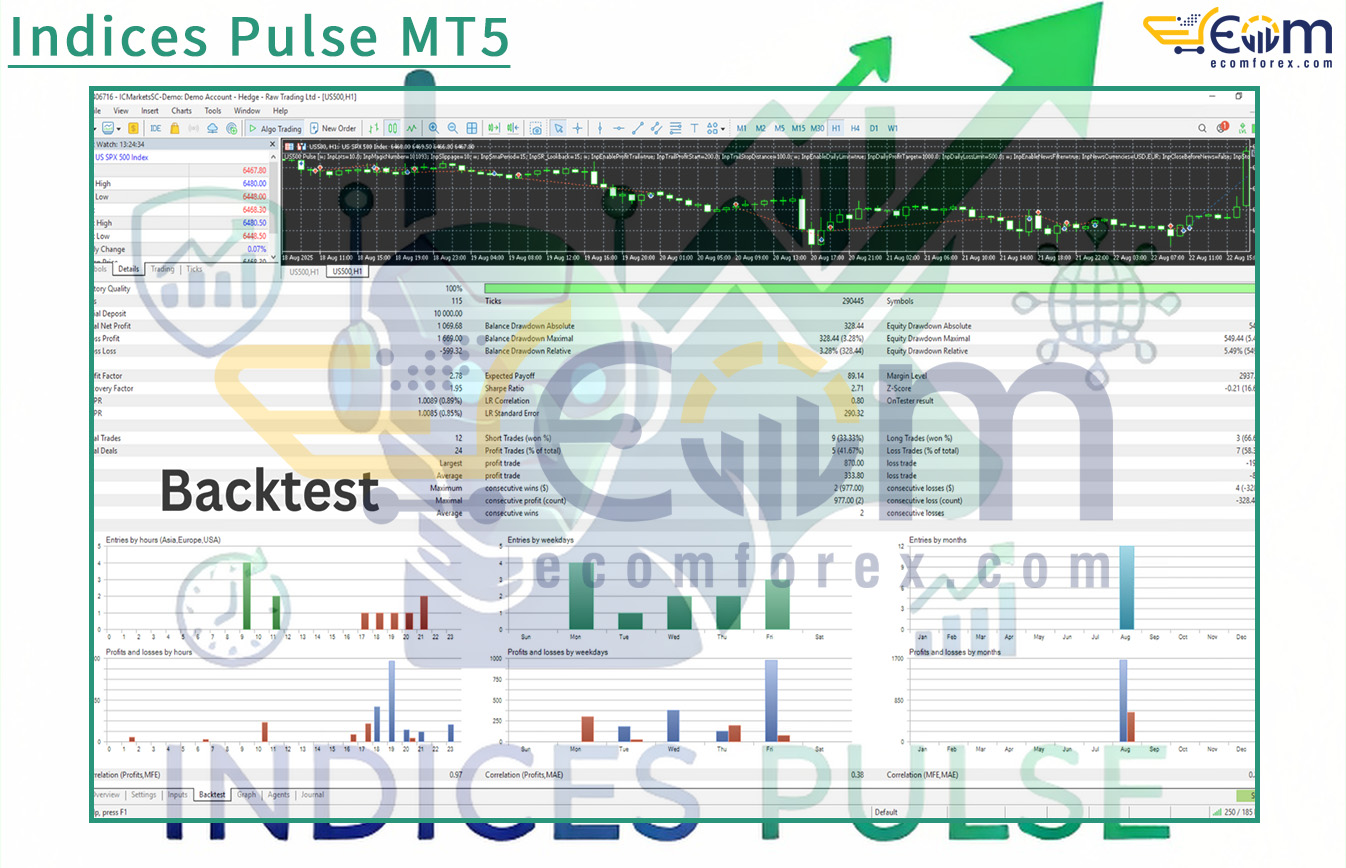 The Indices Pulse EA backtest demonstrates disciplined short-term trading performance, highlighting its ability to combine profitability with strong risk management. In this test on the US500 (S&P 500 Index, H1 chart), the system managed to deliver consistent gains while maintaining controlled drawdowns, proving its reliability for both retail and prop firm traders.