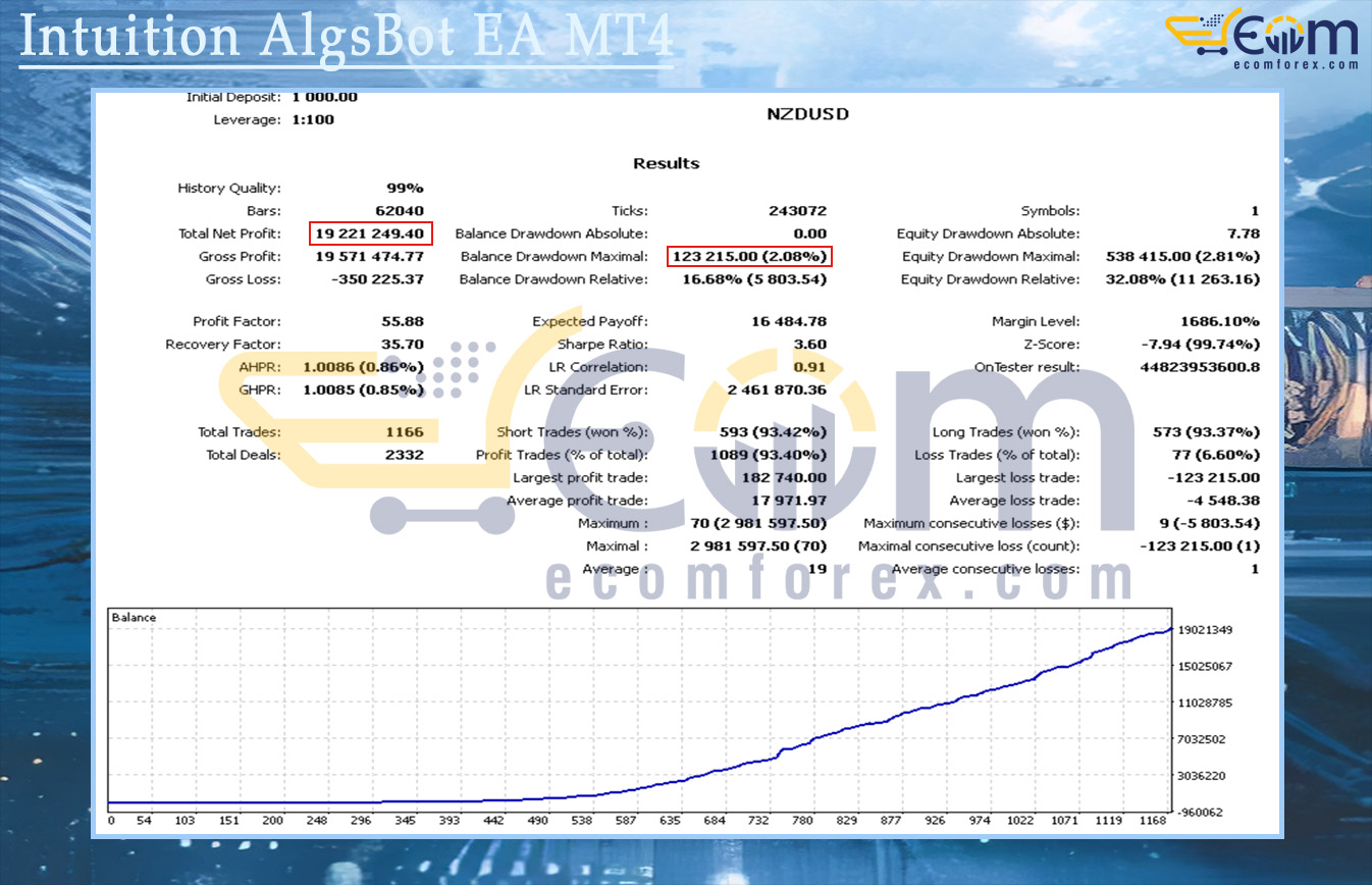 Intuition AlgsBot EA MT4 continued to deliver exceptional long-term profitability in this extensive multi-year backtest on the NZDUSD H1 timeframe, maintaining a clean, steadily rising equity curve with excellent drawdown control.