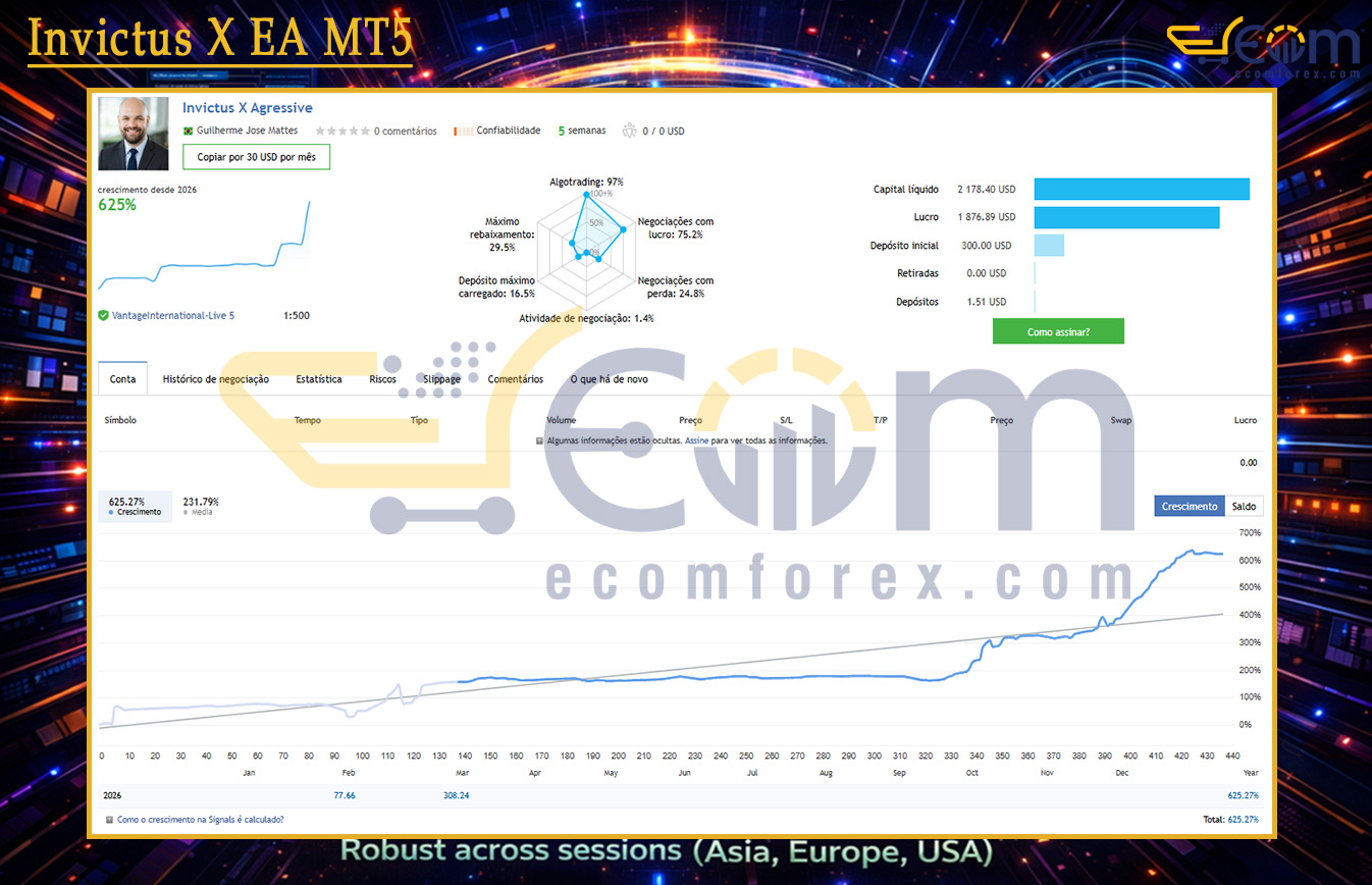 Core Features Smart Volume Analysis : Detects genuine institutional activity and liquidity zones for more accurate and reliable trade entries.Adaptive Trading Logic : Automatically adjusts its behavior based on market waves, volatility, and current structure.Multi-Asset Optimization : Performs excellently on XAUUSD (Gold) and BTCUSD , adapting seamlessly across different market environments.Safe & Clean Execution : Completely avoids dangerous methods such as Grid, Martingale, or excessive risk exposure.Fully Automated : Runs hands-free with minimal user input, delivering consistent and disciplined performance.Invictus X EA MT5 Trading Strategy Volume-Based Entry Zones : Targets high-liquidity areas where strong institutional participation is most likely.Dynamic Market Adaptation : Continuously adjusts trading parameters according to volatility and market structure.Multi-Condition Filtering : Combines volume analysis with multiple confirmations to ensure only high-probability setups are taken.Selective Execution : Trades sparingly but with high precision — quality over quantity.Controlled Risk Approach : Every trade follows structured risk management rules to support stable, long-term account growth.Why Choose Invictus X EA MT5? Long-Term Stability Focus : Engineered for steady, sustainable growth instead of high-risk aggressive trading.Advanced Risk Management : Uses intelligent filtering to keep exposure low and protect your capital effectively.High Market Adaptability : Delivers strong results in both high-volatility and quiet market conditions.Professional Volume Logic : Built on realistic market concepts rather than artificial indicators.Reliable Hands-Free Trading : Ideal for traders who want consistent performance without constant monitoring.Performance of Invictus X EA MT5 Invictus X EA has delivered exceptional real-account performance across both BTCUSD and XAUUSD.
