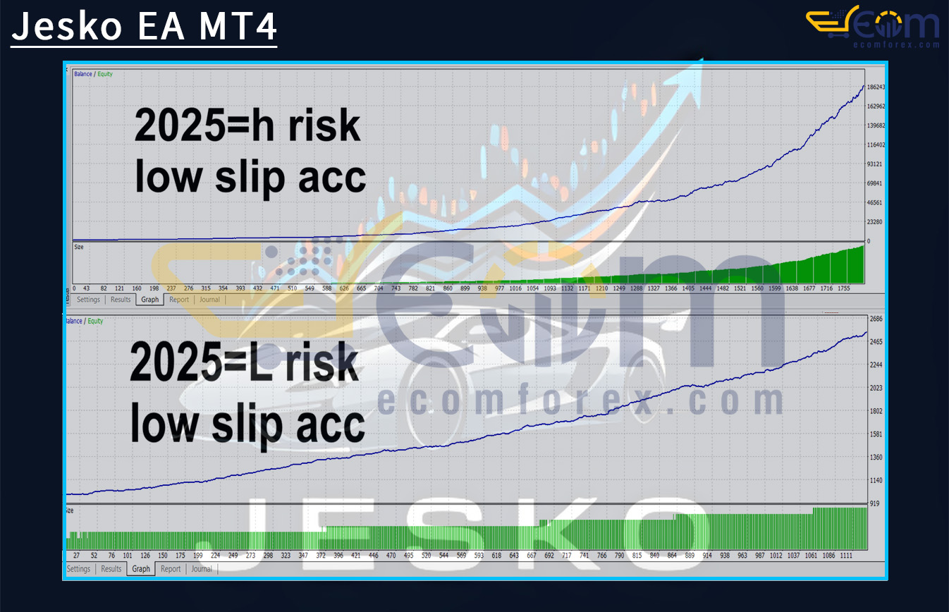Jesko EA delivered strong and stable backtest performance throughout 2025, showcasing its remarkable adaptability across both high-risk (low slippage) and low-risk (standard account) environments. These results highlight the EA’s precision-driven algorithm, capable of maintaining tight drawdown control, dynamic risk adjustment, and consistent capital growth under varying market conditions.