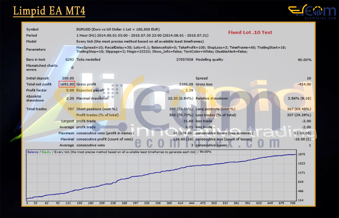 Performance Highlights: Initial Deposit : $200Total Net Profit : $1,691.00 Win Rate : 70.72% Maximum Drawdown : Just 0.84% Limpid EA MT4 Backtests Limpid EA Delivers Remarkable Backtest Performance on EURUSD