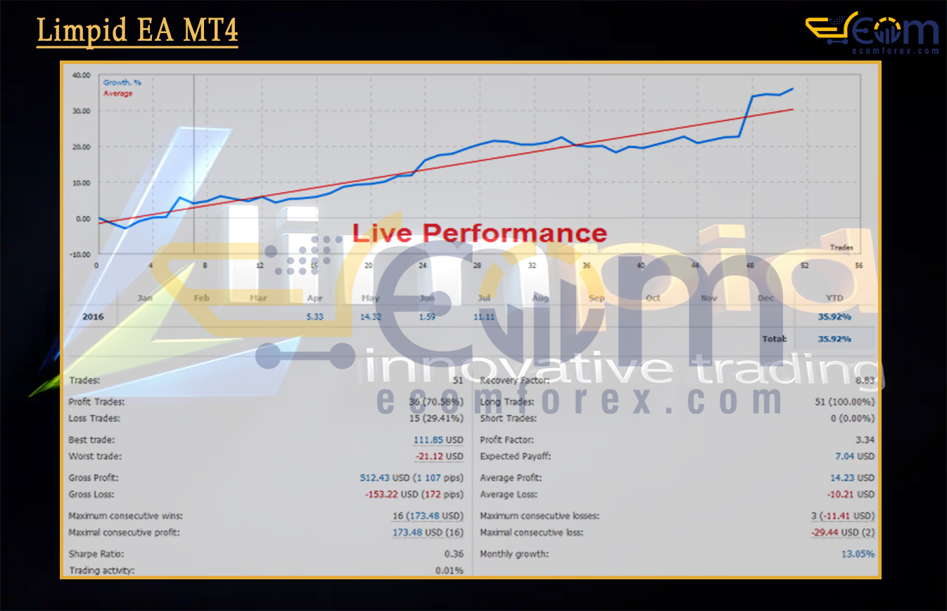 Price Speed & Momentum Analysis : Detects high-probability opportunities based on price velocity and momentum.Multi-Indicator Filtering : Combines several technical indicators to confirm and refine trade entries.Intelligent Pending Order Logic : Places pending orders at key technical levels before significant price moves.Volatility Adaptation : Automatically adjusts to both calm and aggressive market environments.Dynamic Trailing Profit System : Locks in profits efficiently as the market moves in favor of the trade.Why Choose Limpid EA MT4? Stable & Consistent Performance : Built for long-term reliability rather than short-term gains.Strong Risk Protection : Strict Stop Loss and smart filters significantly reduce unnecessary risk exposure.Adaptive to Market Conditions : Performs smoothly in both ranging and trending markets.User-Friendly Setup : Simple and intuitive configuration, suitable for beginners and experienced traders alike.Professional Automated Solution : A reliable, marketplace-ready EA ideal for traders seeking steady, hands-off trading.Performance of Limpid EA MT4 Limpid EA has been independently verified by MyFxBook over the long term, delivering impressive and consistent returns on EURUSD.
