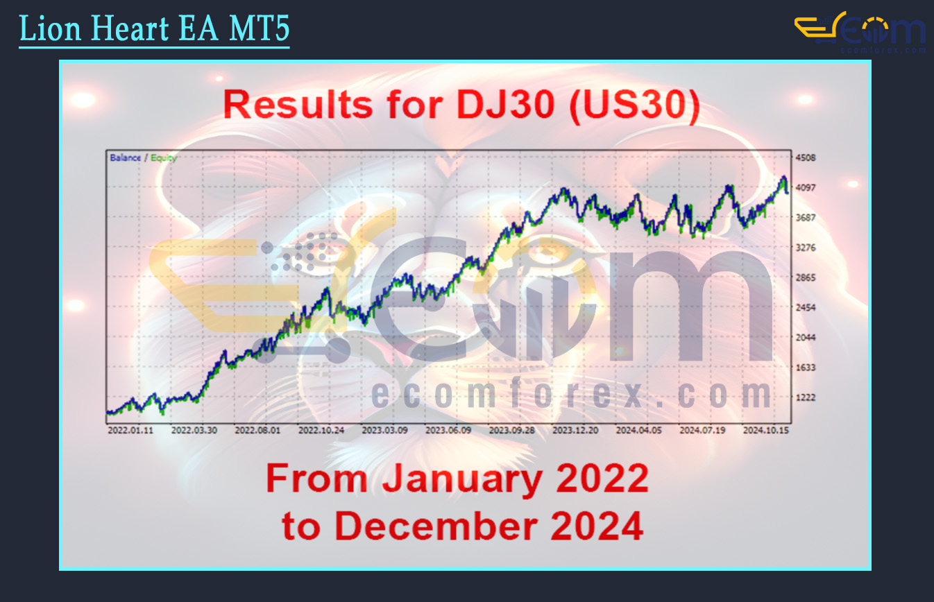 Lion Heart EA MT5 is a fully automated Expert Advisor (EA) (MT5) that uses momentum analysis combined with trend assessment to identify strong, high-probability directional moves on major US indices. It trades infrequently — typically 1 trade per day or less — only when all conditions align perfectly. Not sensitive to broker execution speed; ideal for NASDAQ 100 (US100), S&P 500 (US500), and DJIA (US30) with default settings.