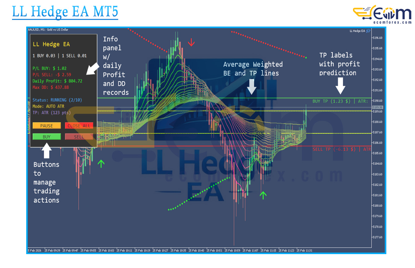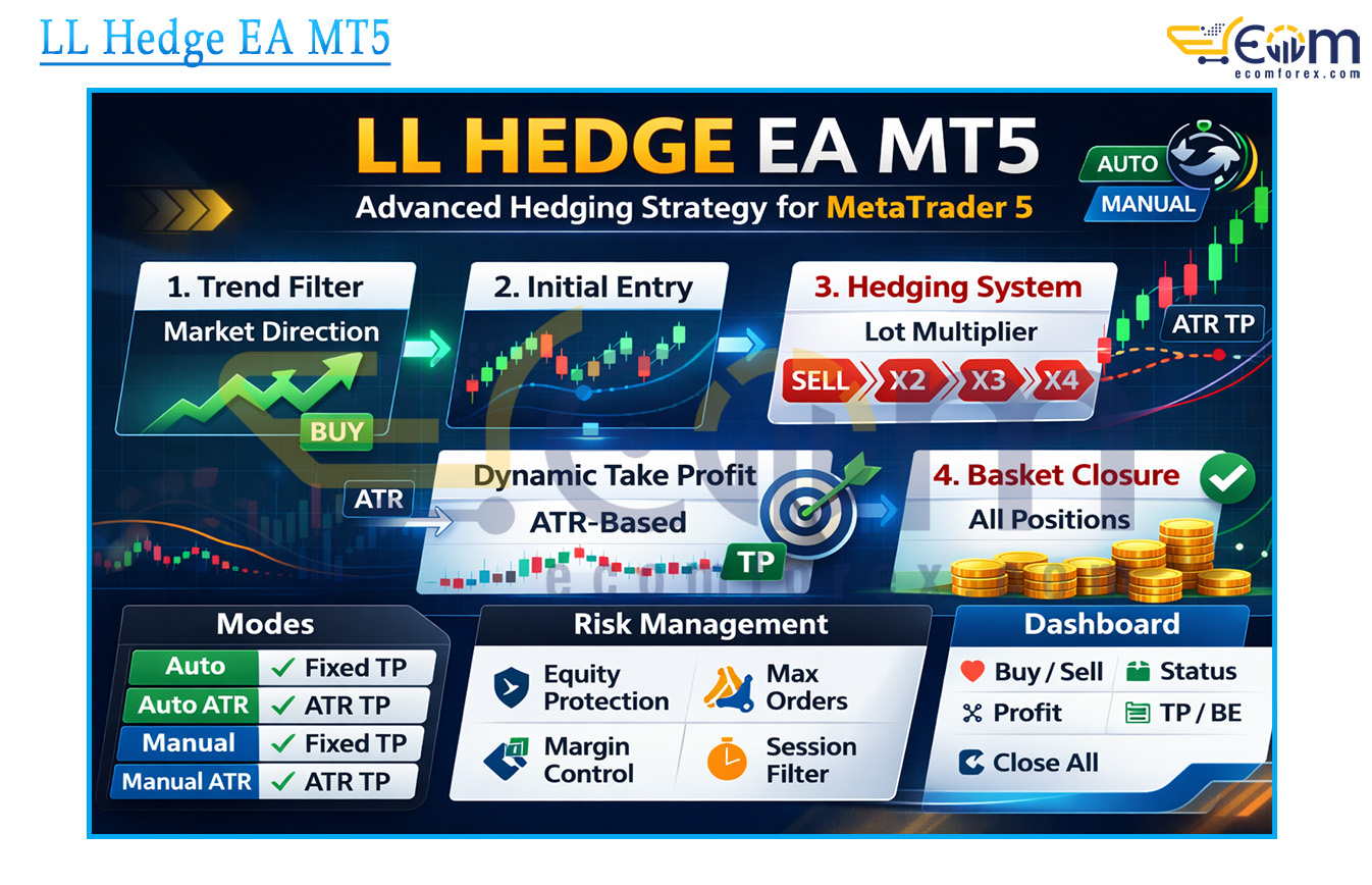LL Hedge EA MT5 is a structured hedge recovery system that uses a controlled hedging approach to manage drawdown and recover losing positions. Unlike typical aggressive hedging EAs, it focuses on stability, efficiency, and disciplined execution. The system employs a centralized position cache to minimize CPU usage, making it highly suitable for long-term VPS operation.