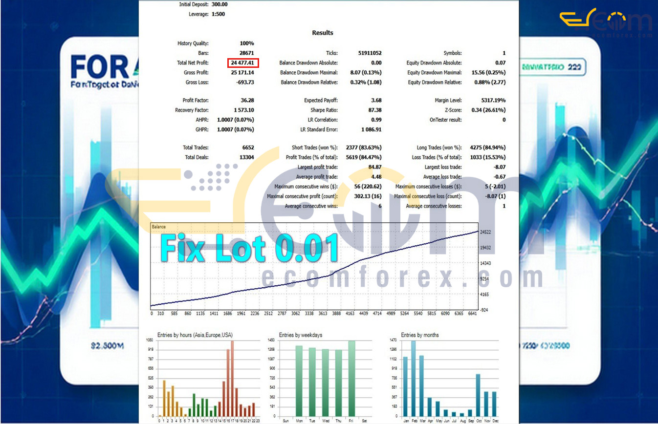 M15 Trend Value Zone EA MT5 delivered remarkable profitability in this extensive backtest, growing a modest $300 initial deposit into $24,477.41 net profit using a fixed lot of 0.01. With a strong overall win rate of 84.47% (83.63% on short trades and 84.94% on long trades), the EA showcased the power of its intelligent core — combining adaptive AI filters, Smart Value Zone detection, and Neural Momentum Filter on the M15 timeframe.
