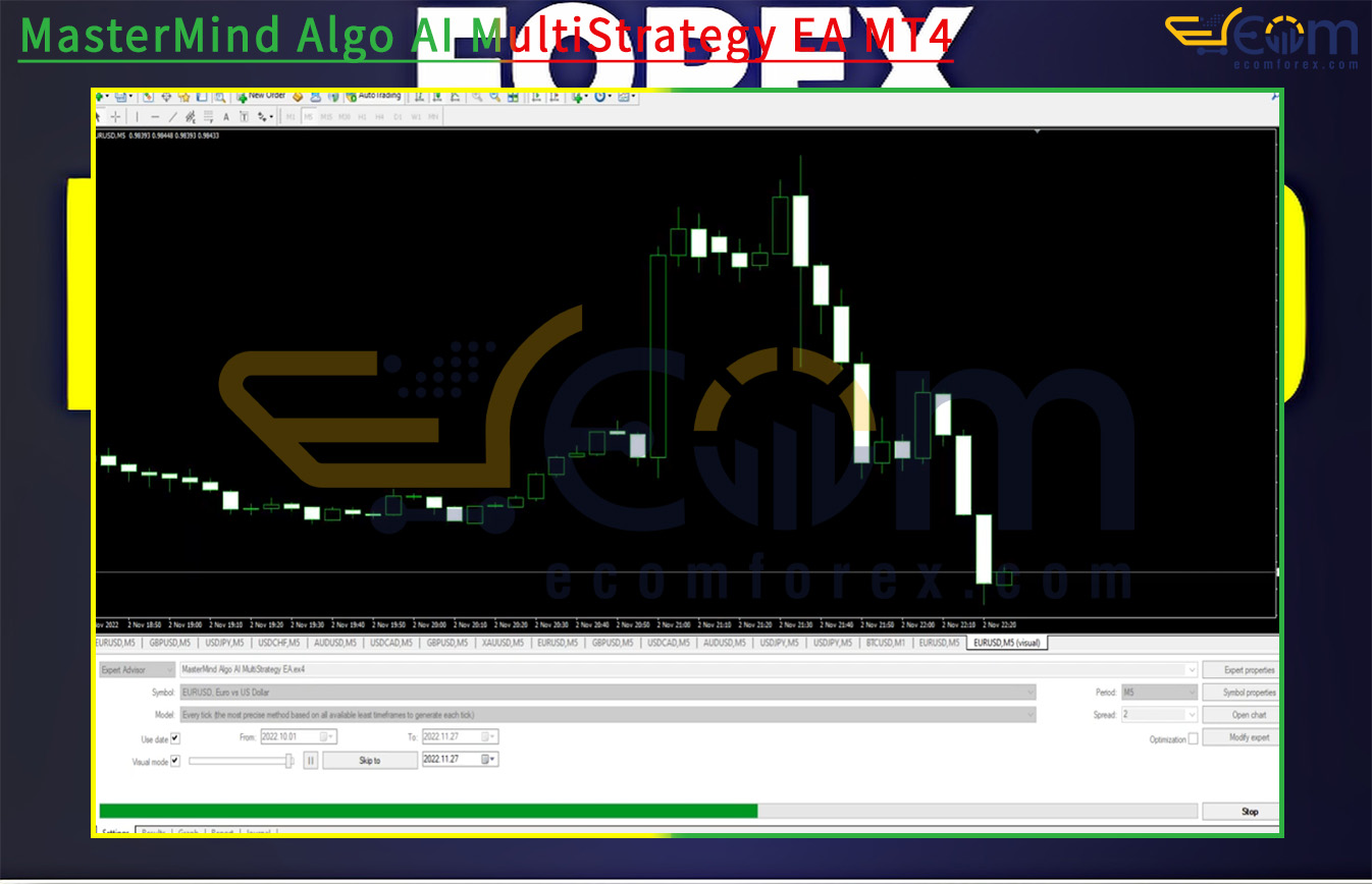 Forex MasterMind Algo AI has shown impressive results during backtesting, confirming its ability to capture multi-strategy opportunities with exceptional precision and stability. Operating on the EURUSD M5 timeframe, the system maintained smooth equity growth and consistent profitability while keeping drawdowns remarkably low — a hallmark of professional-grade algorithmic engineering.