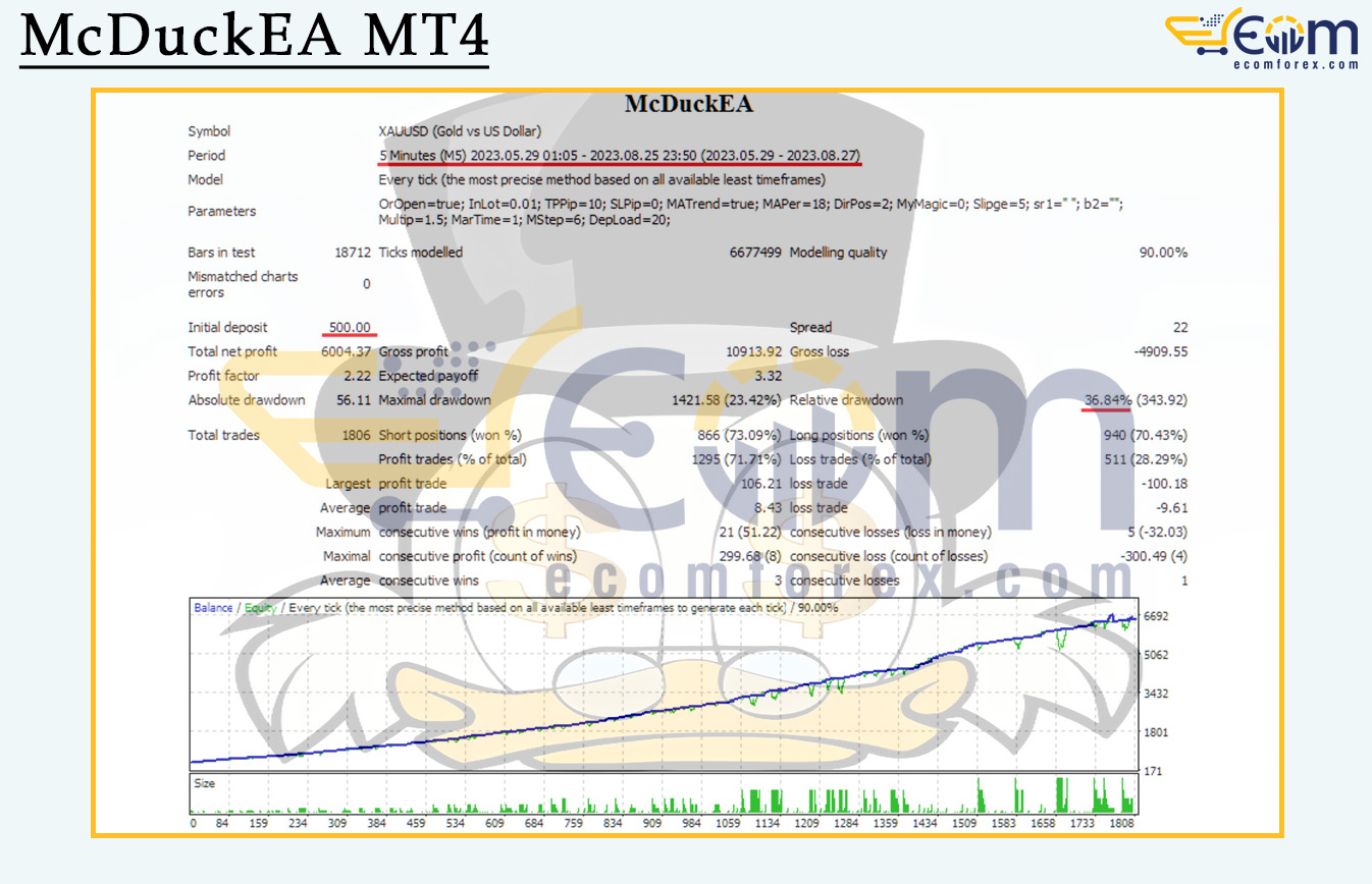 The McDuckEA MT4 backtest demonstrated outstanding profitability over a 3-month testing period on the XAUUSD (Gold) pair, delivering strong, sustained gains even on the fast 5-minute timeframe.