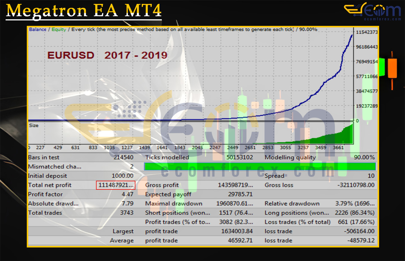 The Megatron EA MT4 showcased outstanding profitability in its 24-month EURUSD backtest, delivering exponential growth while keeping risk tightly controlled. The system maintained strong trend-aligned execution and exceptional stability, proving its ability to generate massive returns with minimal drawdown.