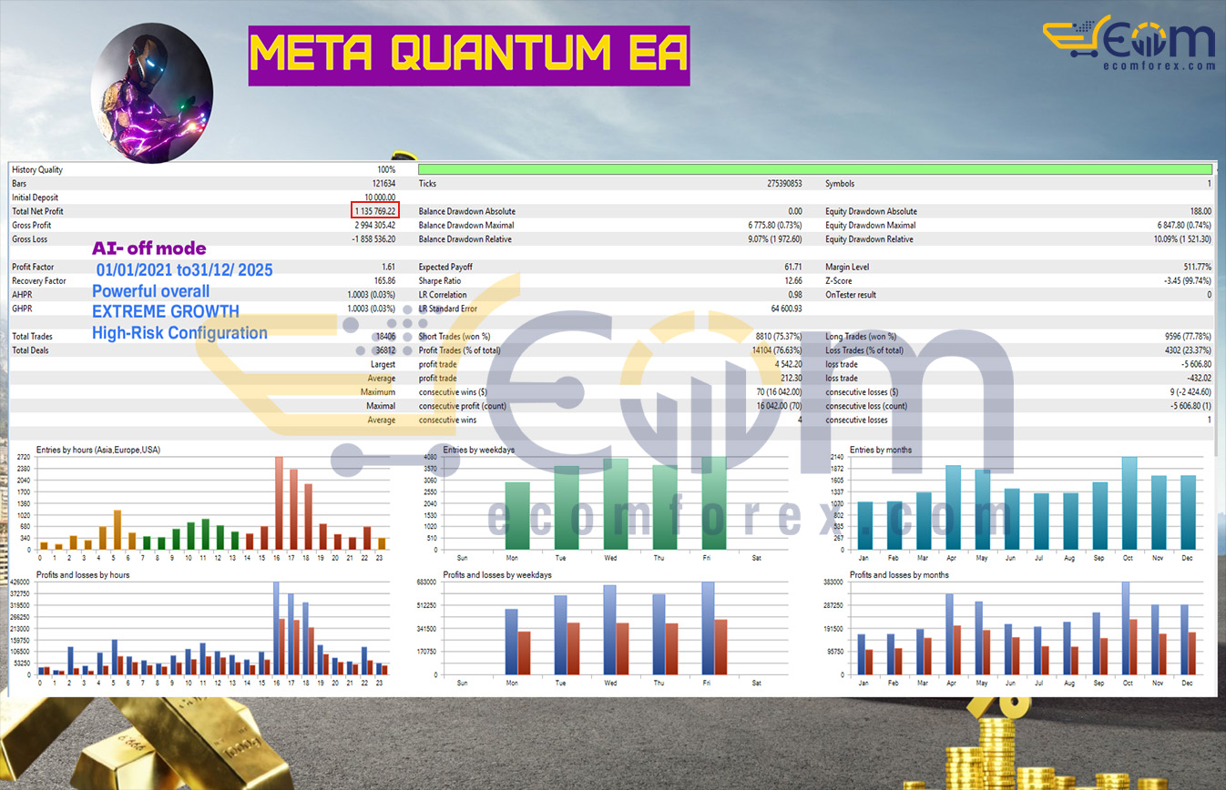 META QUANTUM EA delivered exceptional long-term profitability over a 5-year backtest (01/01/2021 to 31/12/2025) on XAUUSD (gold), showcasing outstanding stability and high win-rate performance in AI-OFF mode. Its hybrid rule-based + machine learning foundation, combined with disciplined medium-frequency entries and strict risk controls, enabled massive compounding growth with remarkably low drawdowns — even without active AI filtering.