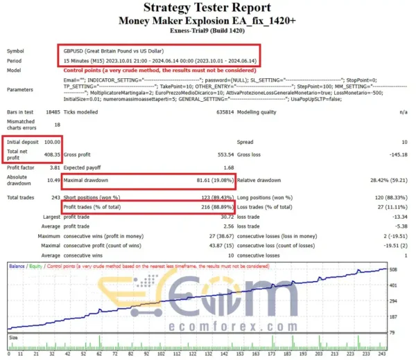 Money Maker Explosion EA was evaluated with a starting capital of $100, resulting in an impressive profit of $500 over 8 months, with a capital drawdown of only 19%.