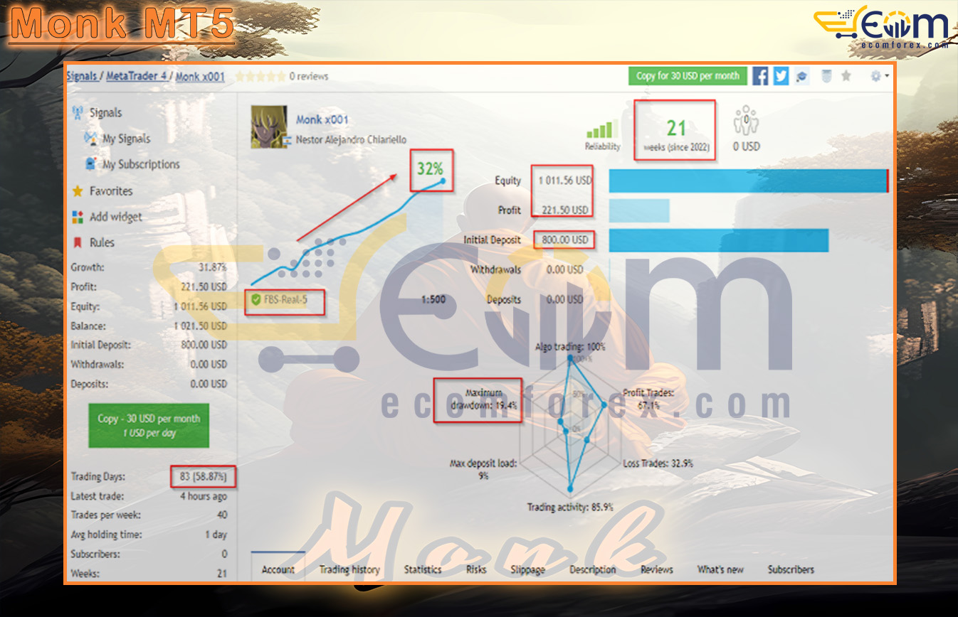 Monk x001 EA has demonstrated verified live trading performance on the FBS-Real-5 account, fully tracked and confirmed over a 3-week period since 2022.