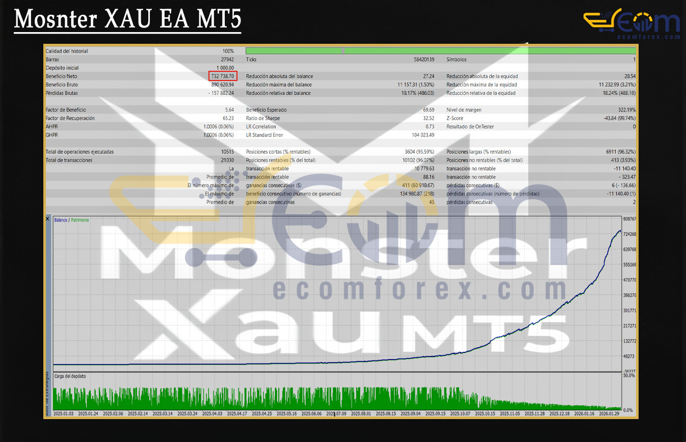 Mosnter XAU EA showcased exceptional long-term profitability in this backtest on the XAUUSD (Gold) pair, delivering explosive growth from a modest starting balance while exhibiting remarkably disciplined risk control for a high-frequency scalping system. With over 10,000 trades executed across a substantial historical period (≈27,942 bars / millions of ticks), the EA demonstrated ultra-high win rates, strong profit consistency, and contained drawdowns even in gold’s volatile environment.
