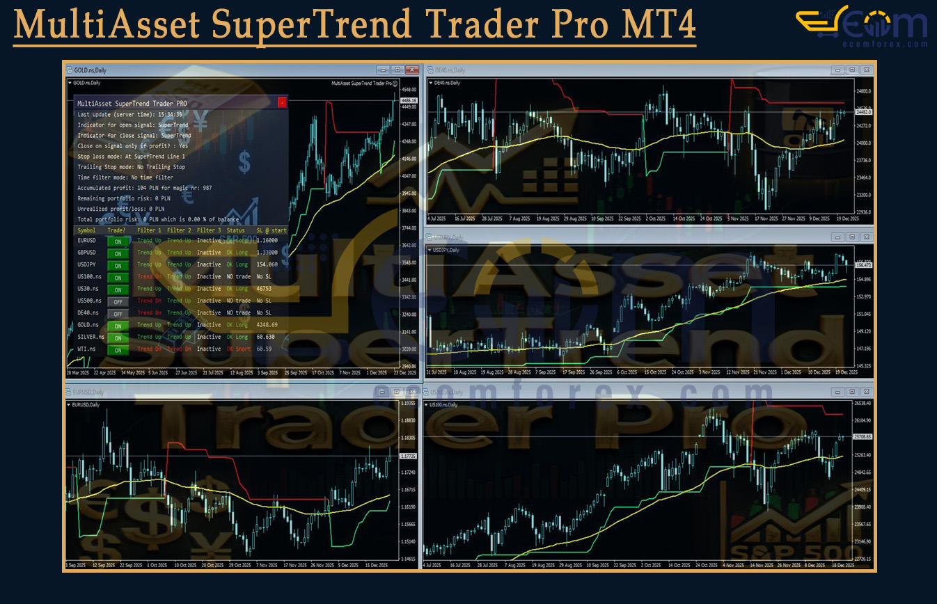 I’m a professional trader with 20 years of experience in Forex, indices, and commodities. After testing hundreds of EAs, MultiAsset SuperTrend Trader Pro MT4 stands out as one of the most sophisticated and powerful multi-asset trend-following systems available on MT4 today.
