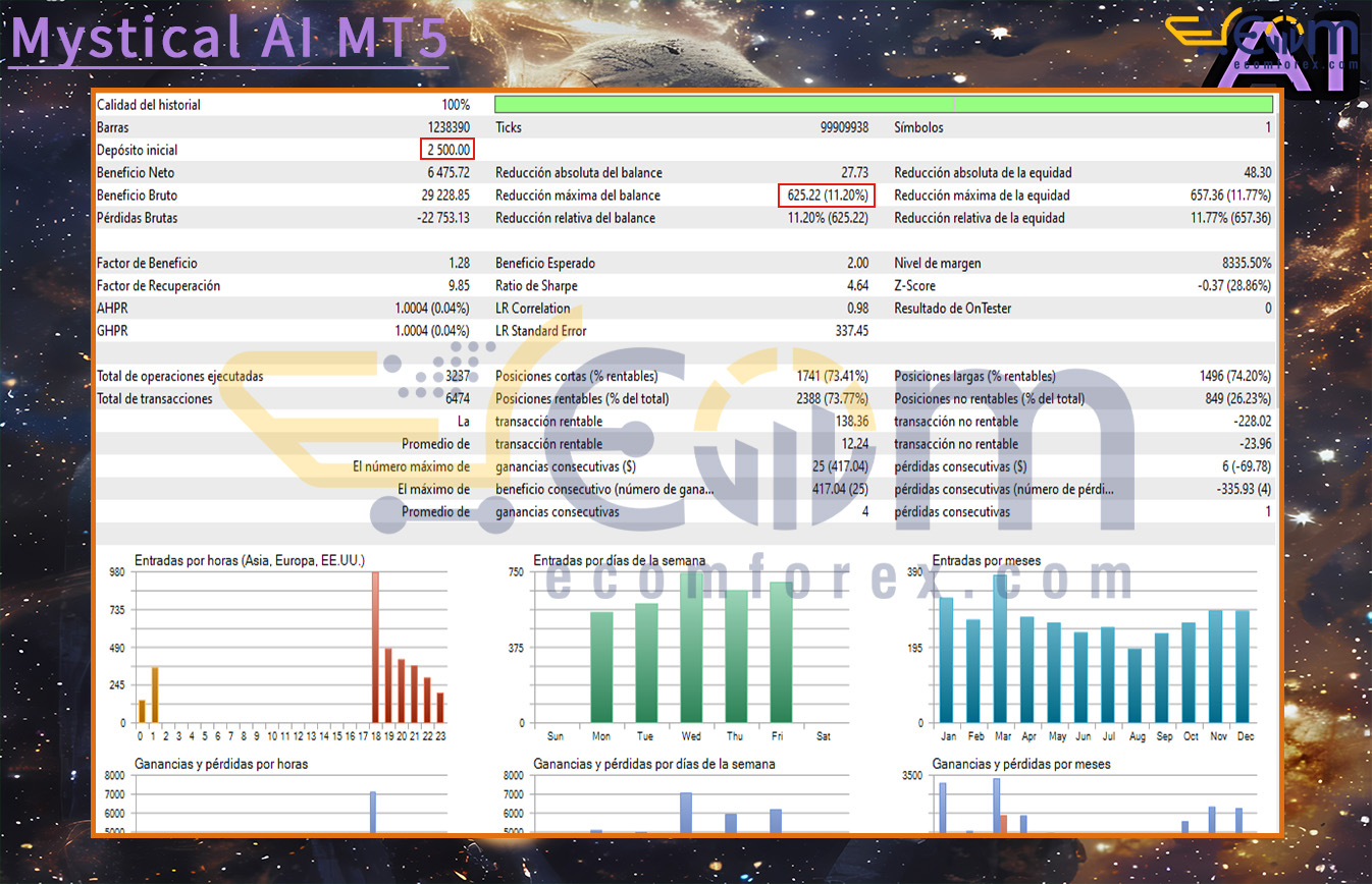 Mystical AI demonstrates steady and reliable performance, combining profitability with disciplined risk management. In this backtest, the system showed sustainable equity growth while keeping drawdowns at controlled levels, making it a robust choice for traders seeking long-term stability.