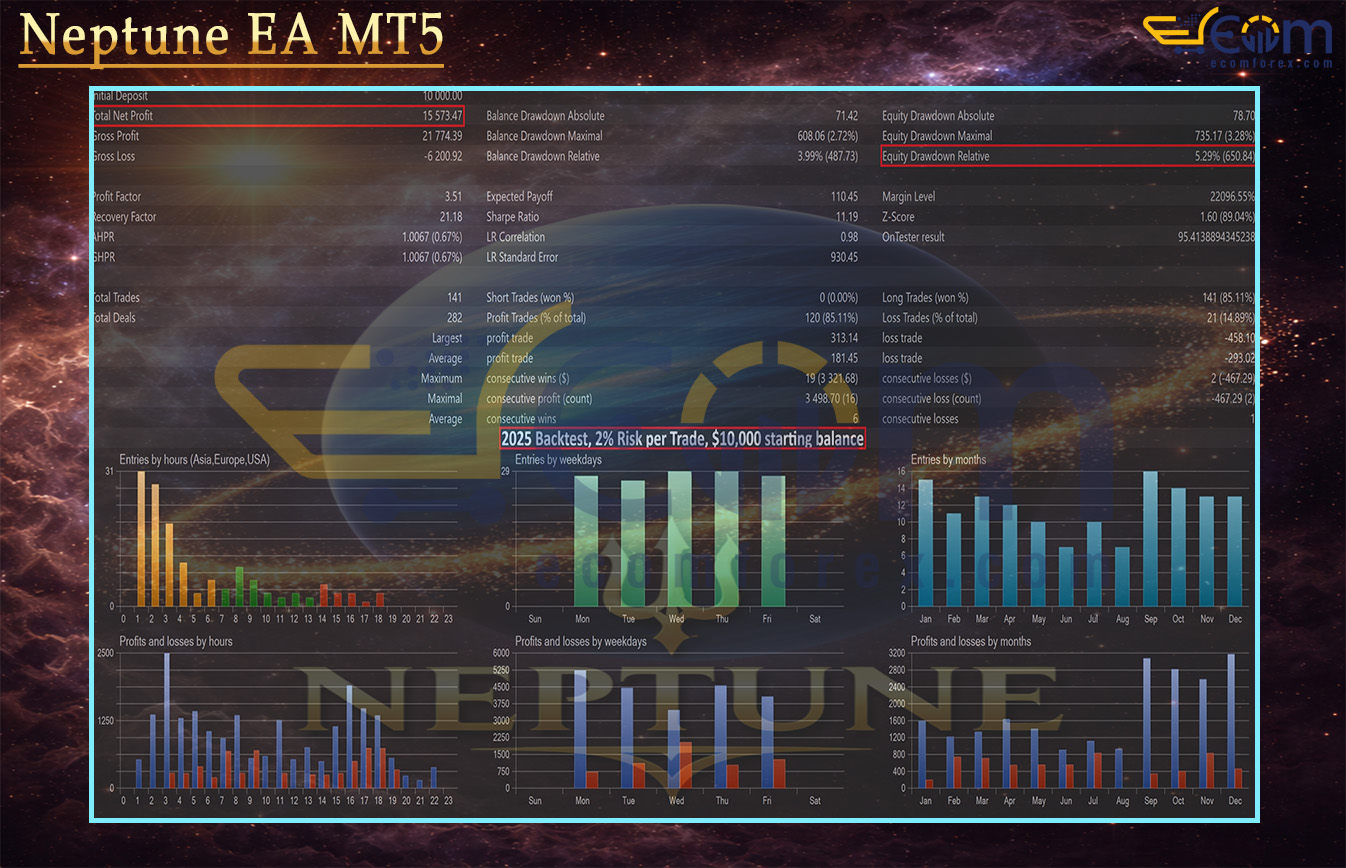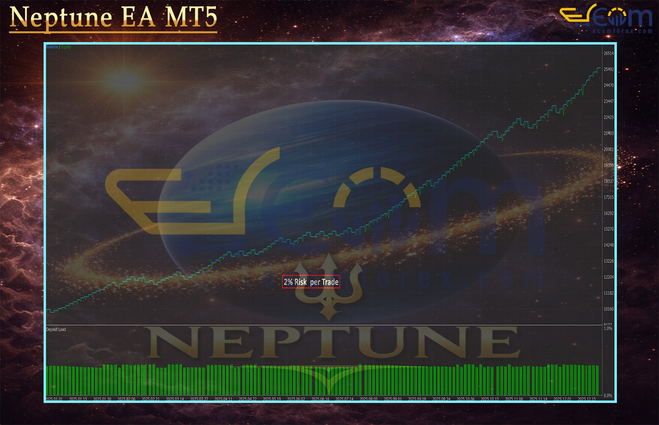 Neptune EA delivered outstanding aggressive performance in its full-year 2025 backtest on XAUUSD, generating massive growth with 10% risk per trade while keeping drawdown reasonable for the high-risk setting, thanks to its selective trend-following logic and strict single-position management.