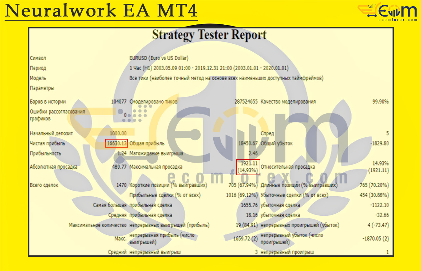 Neuralwork EA has demonstrated outstanding long-term profitability and solid risk control over a 17-year backtest period (2003–2019) on the EURUSD (H1 timeframe).