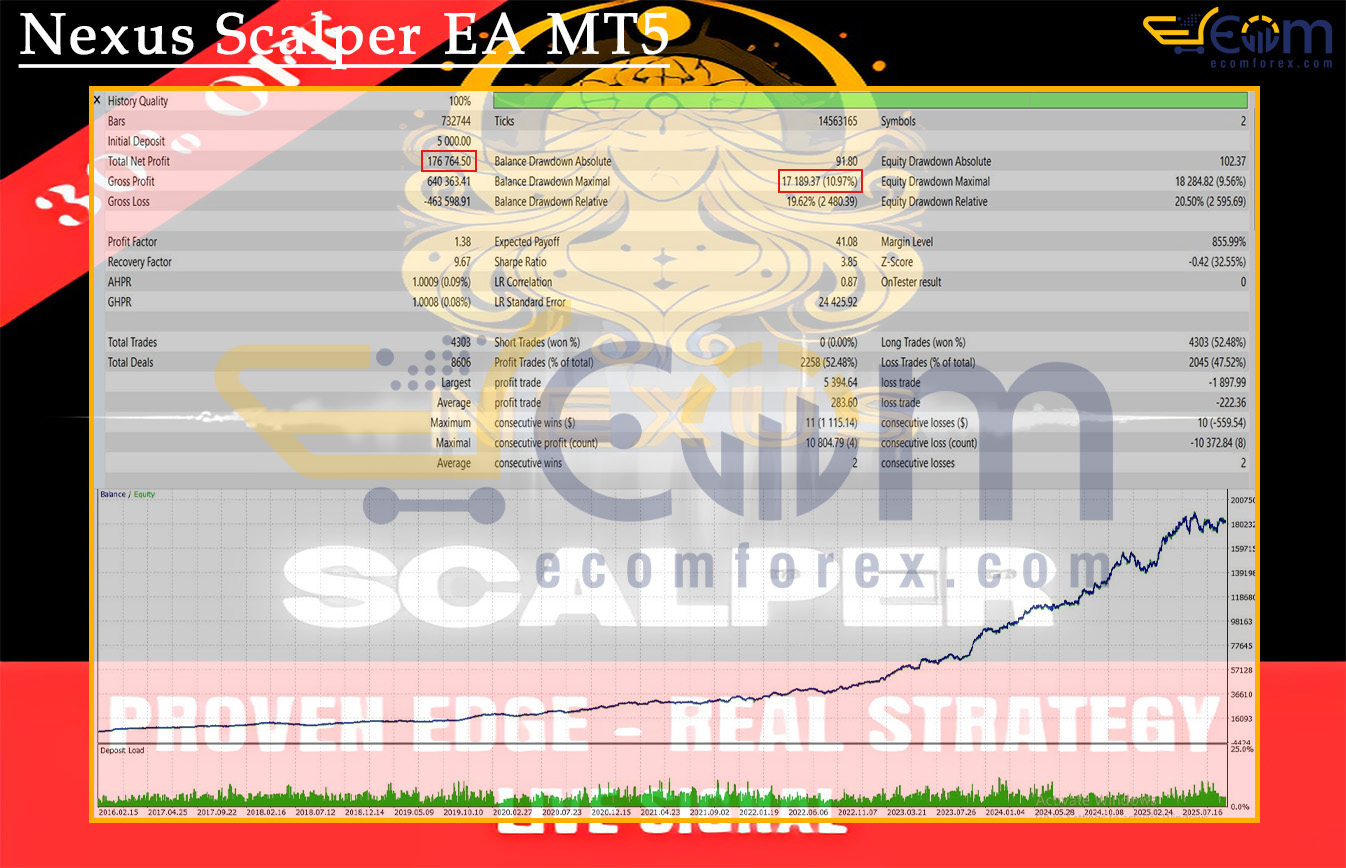 This system represents a breakthrough in scalping technology. While most scalping EAs are extremely sensitive to spreads, slippage, and price feed variations, Nexus Scalp EA is a rare exception — a scalper that remains stable, reliable, and robust across different brokers and market conditions.
