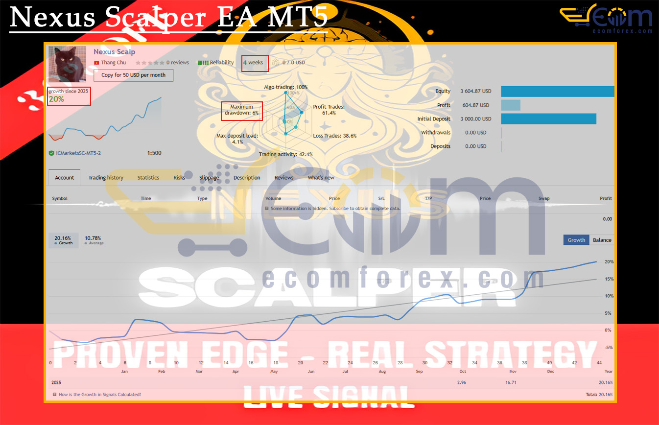 Nexus Scalper EA MT5 has showcased verified live performance over a 4-week real-account tracking period, demonstrating stable growth, disciplined execution, and controlled drawdown.