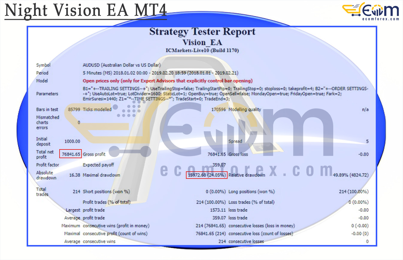 Vision EA has demonstrated outstanding profitability and flawless trade precision during its backtesting phase on the AUDUSD (M5 timeframe) using default parameters.