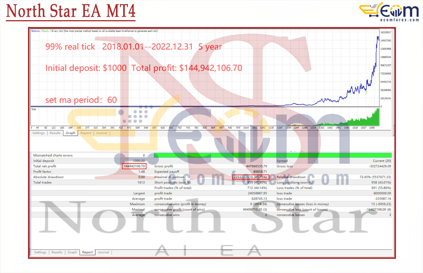 North Star EA delivered exceptional long-term profitability over a 5-year backtest period (2018–2022), maintaining a steep exponential equity curve even with a modified MA period of 60.