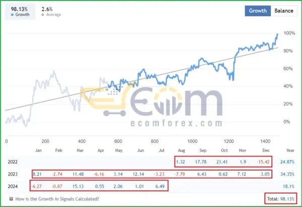 Growth since 2022 98% in 104 weeks Algo trading 100% Profit trades 58,9% Loss trades 41,1% Trading activity 86,4% Max deposit load 3,7% Maximum drawdown 30%.