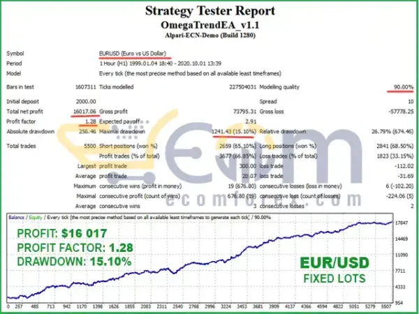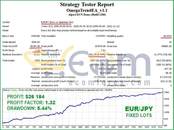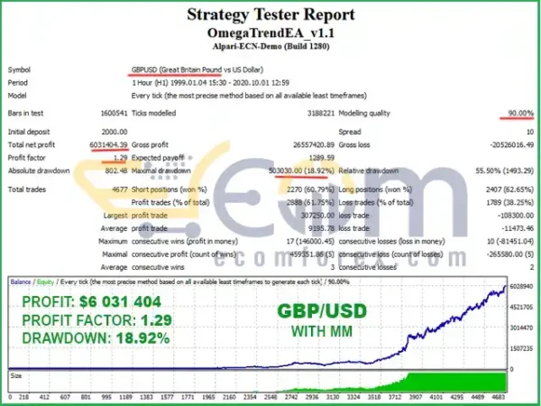 The backtest results of Omega Trend EA using currency pairs such as GBPUSD, EURUSD, and USDJPY indicate tremendous profit potential over the long term.