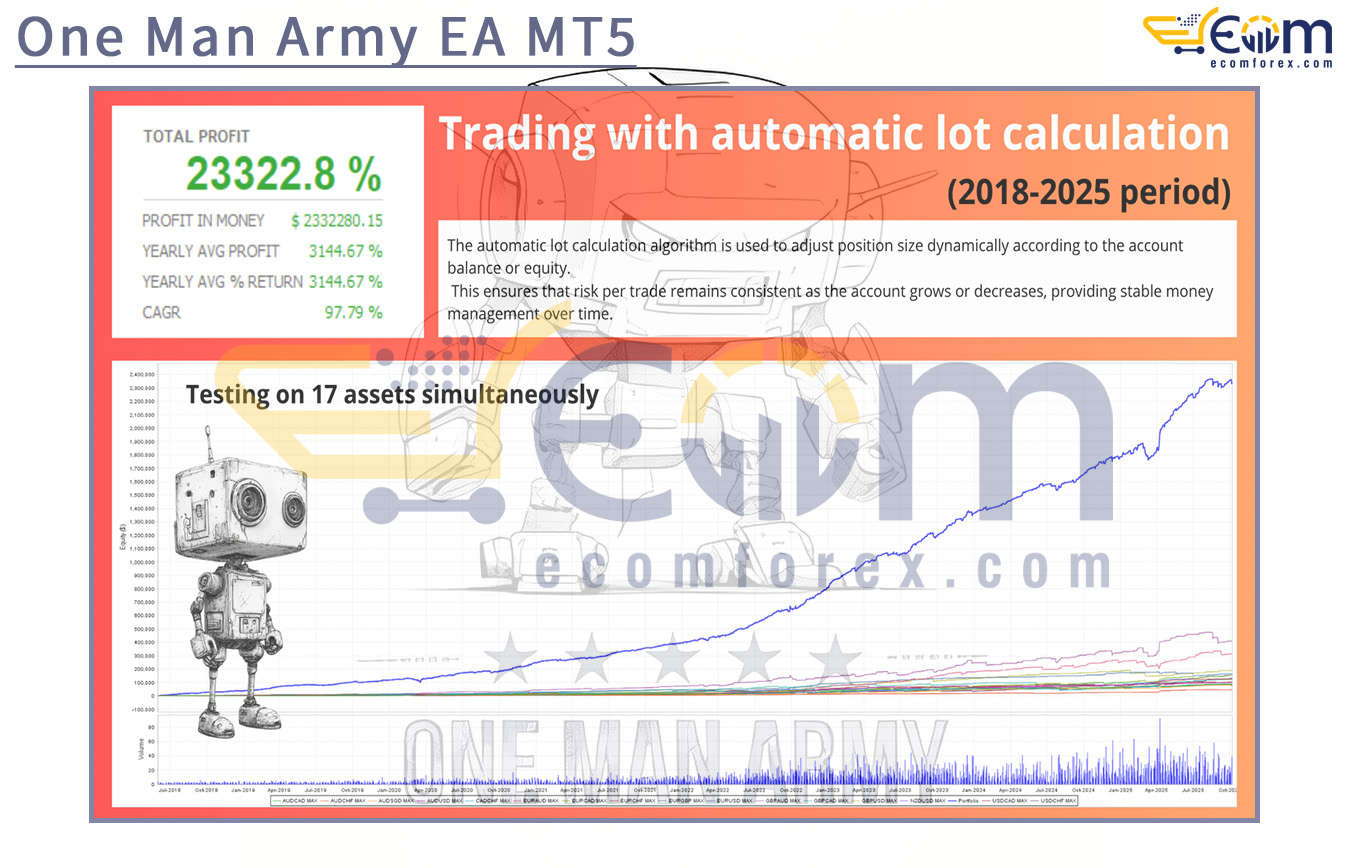 One Man Army EA has demonstrated extraordinary performance during its multi-asset backtesting phase from 2018 to 2025, confirming its ability to deliver stable, exponential growth through intelligent automatic lot calculation.