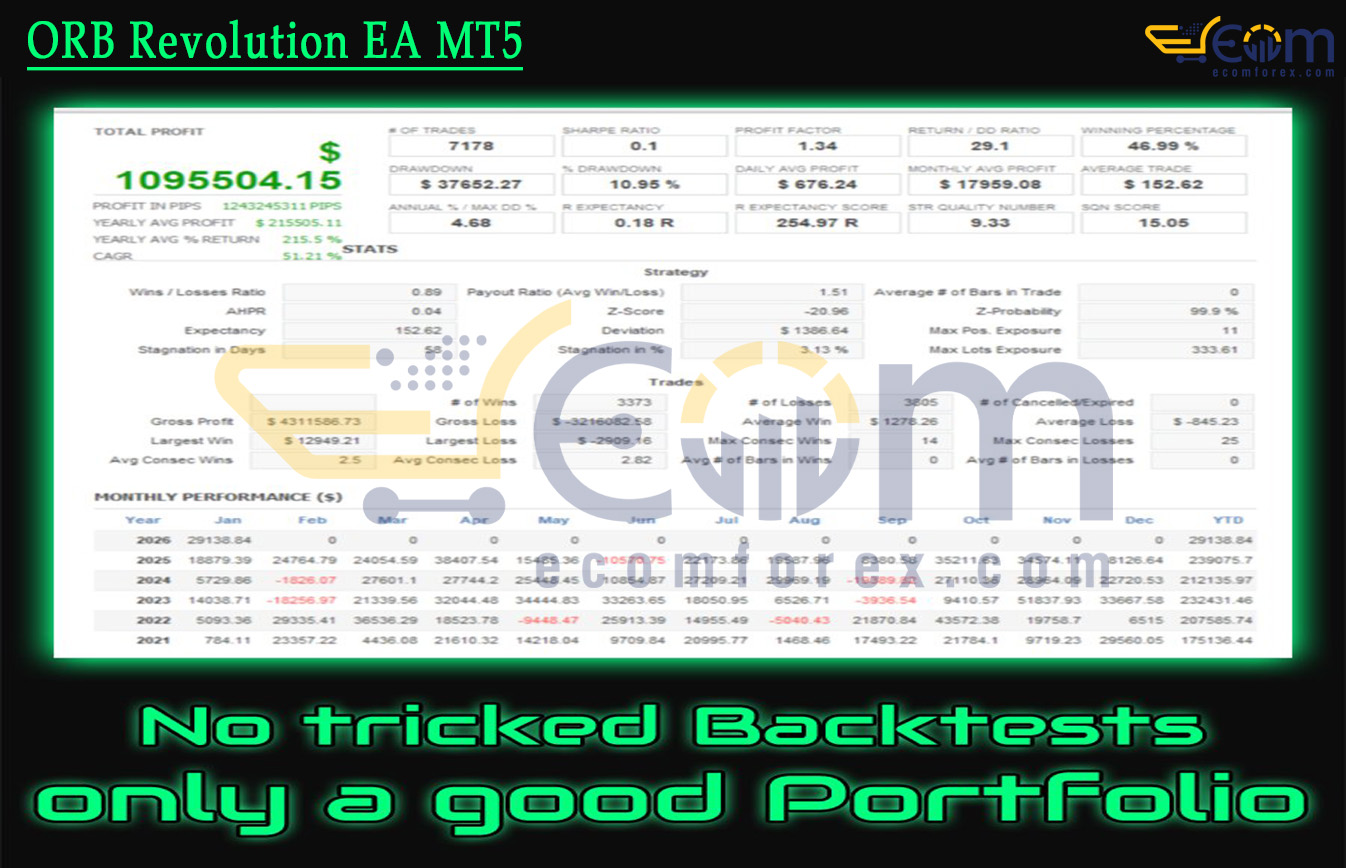 ORB Revolution EA MT5 is a sophisticated, professional-grade Expert Advisor (EA) for MetaTrader 5 (MT5), engineered specifically for Opening Range Breakout (ORB) trading — one of the most respected institutional strategies in forex and indices. It captures explosive moves from the initial session range (Asian, London, New York) while enforcing institutional-level risk discipline through multi-layer filters, volatility validation, trend alignment, and strict capital safeguards.
