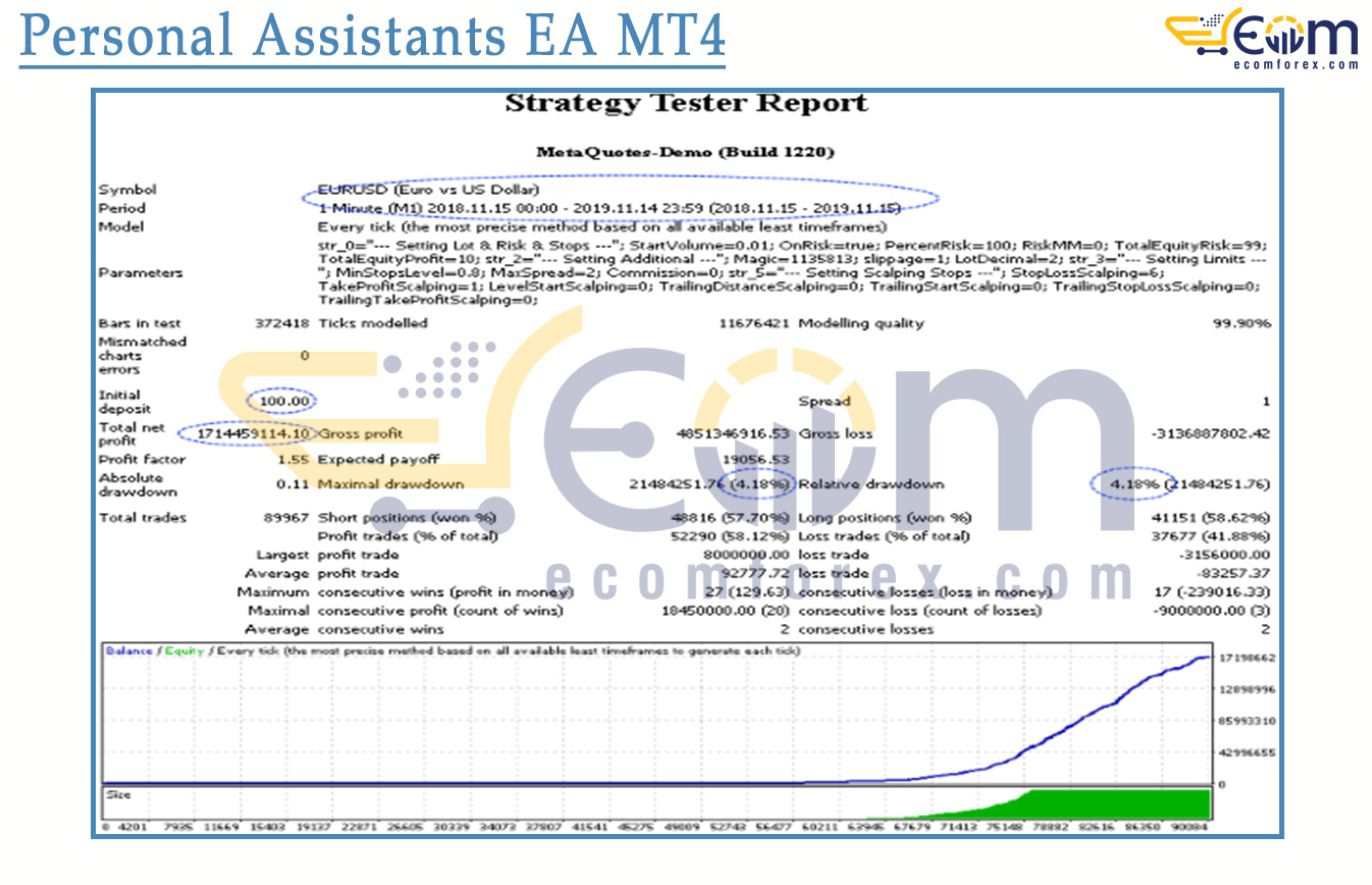 Personal Assistants EA MT4 delivered outstanding long-term profitability in this high-frequency EURUSD M1 backtest, maintaining a smooth and steadily rising equity curve while keeping drawdown exceptionally controlled.