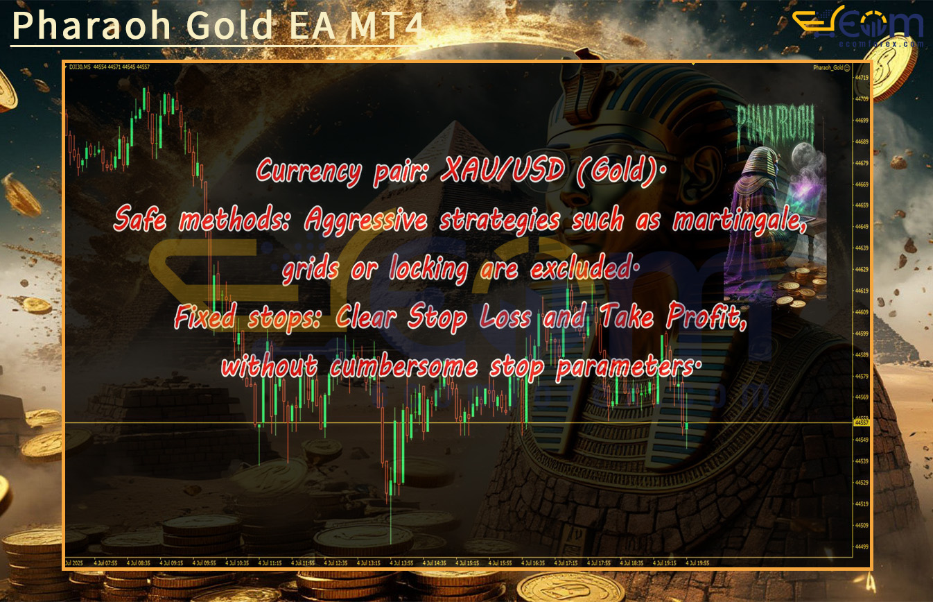 Pharaoh Gold EA MT4 is an advanced Expert Advisor designed for trading Gold (XAUUSD) and multiple currency pairs, with a strong focus on minimizing risks and maximizing potential profits. The EA primarily operates through pending orders in the direction of the main market trend, ensuring optimal entry and exit points.