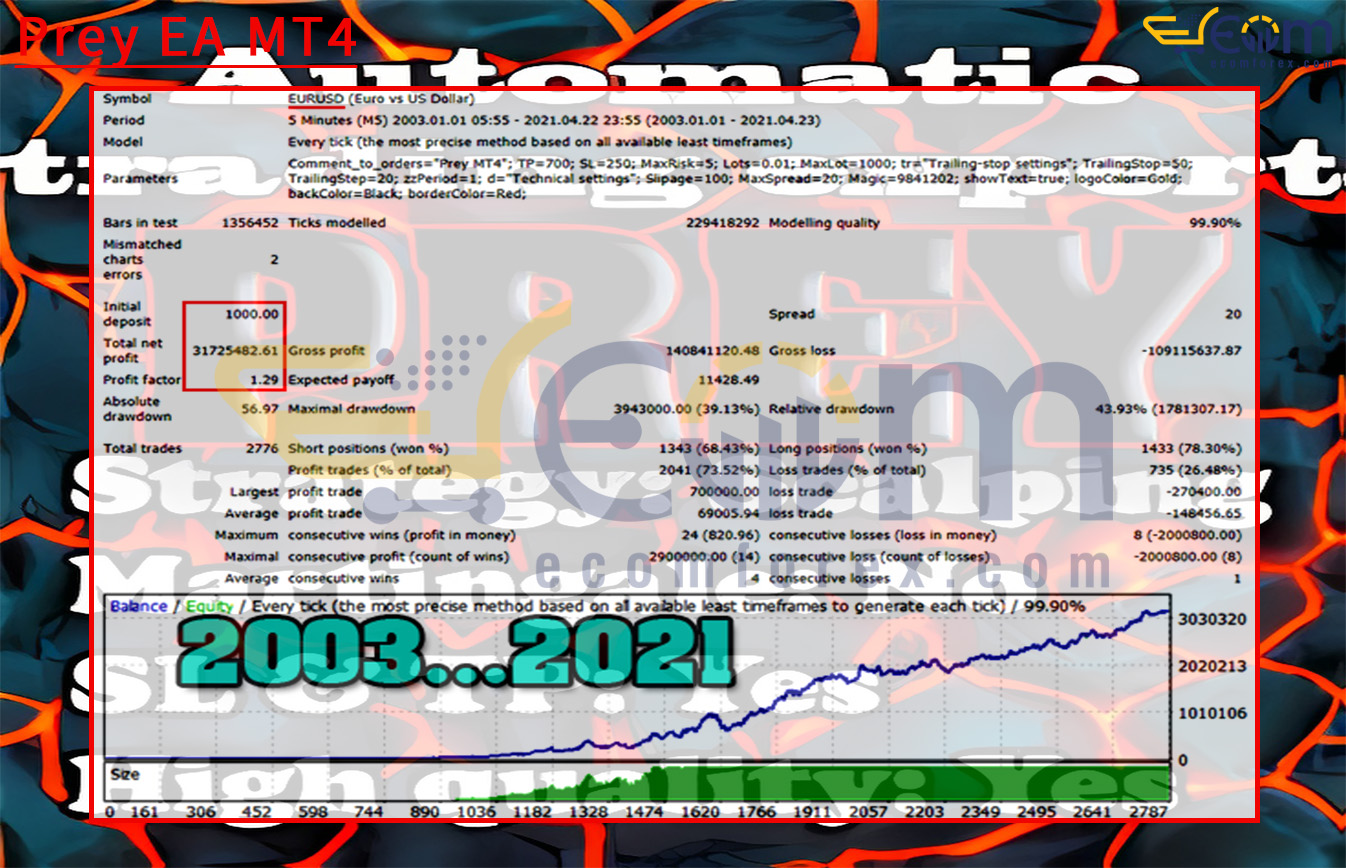 The Prey EA has demonstrated remarkable profitability and consistency in long-term backtesting, showcasing its ability to generate steady returns over nearly two decades. During the 18-year testing period (2003–2021, EURUSD, M5 timeframe), the system delivered powerful results with disciplined risk management, making it a reliable choice for traders seeking sustainable long-term growth.