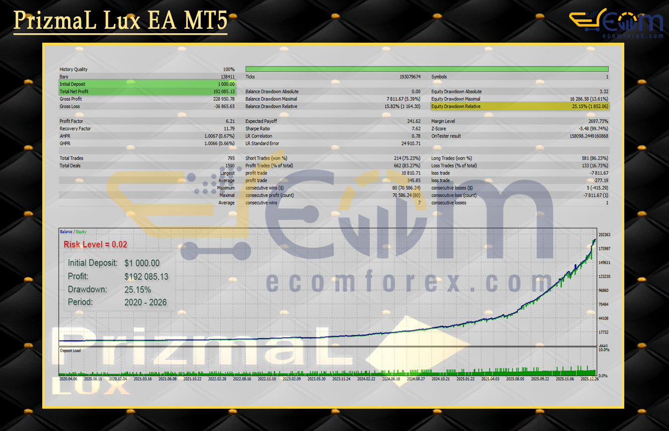 PrizmaL Lux EA has once again demonstrated its exceptional long-term edge and disciplined intelligence in a comprehensive 6-year backtest (2020–2026) on XAUUSD (Gold), confirming its remarkable ability to adapt to shifting market structures while delivering strong, consistent compounding with ultra-low risk exposure.