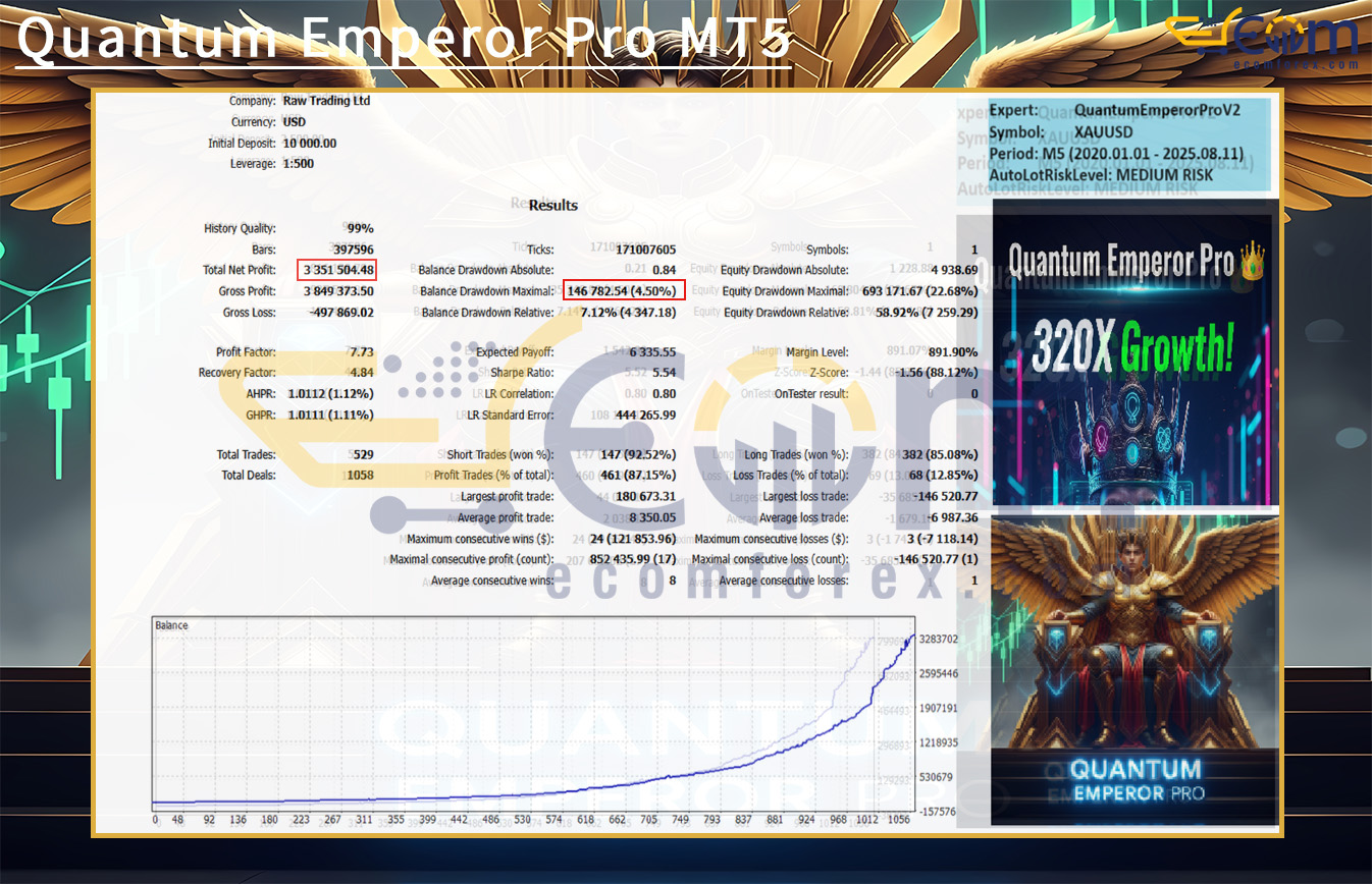 The Quantum Emperor Pro V2 EA demonstrates exceptional profitability and disciplined trade management, reflecting a powerful balance between aggressive growth and sustainable risk control. In this backtest on XAUUSD (M5 timeframe), starting with an initial deposit of $10,000, the EA generated an extraordinary $3,351,504.48 net profit, achieving over 320X growth while maintaining a steady equity curve and controlled drawdowns. These results highlight its ability to combine massive profit potential with long-term account safety.