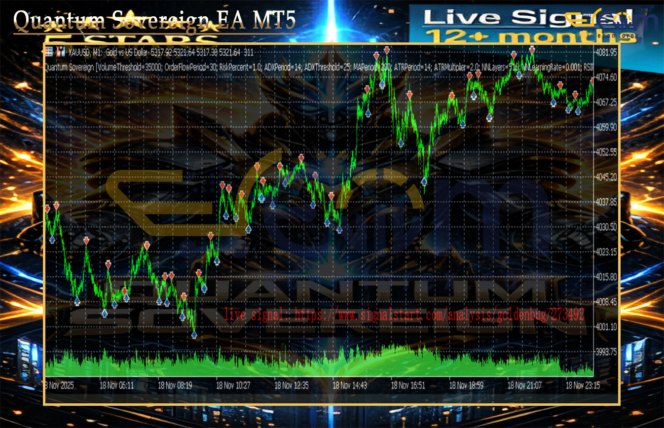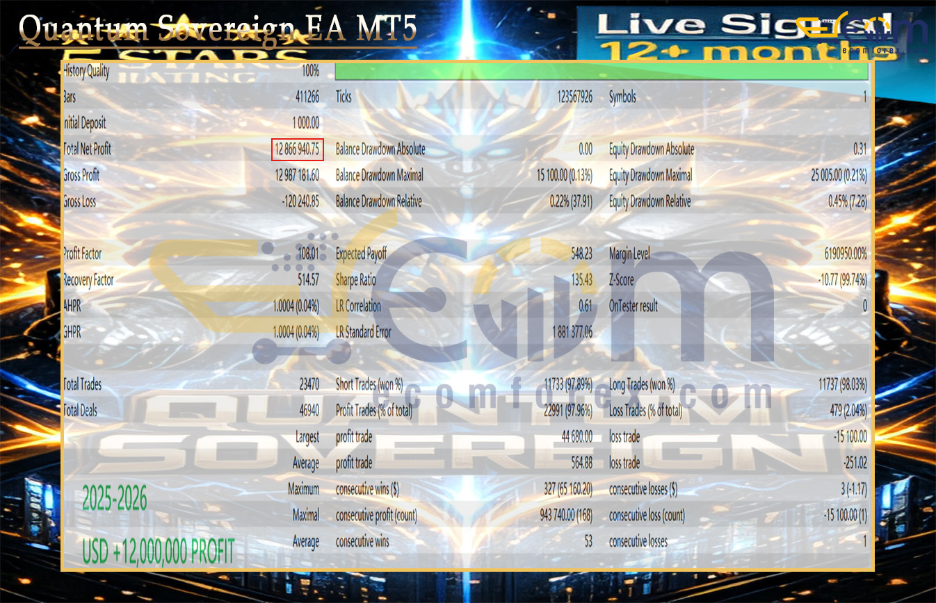 Quantum Sovereign EA MT5 is a cutting-edge MT5 Expert Advisor (EA) engineered exclusively for fully automated XAUUSD (gold) trading.