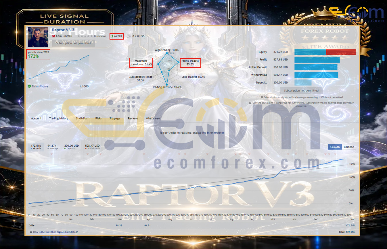Initial Deposit : $500Total Growth : +173% Win Rate : 83.6% Maximum Drawdown : 61.4% Raptor V3 EA MT5 Live Signal The Raptor V3 EA has delivered exceptional results when trading the US30 index on a real account.