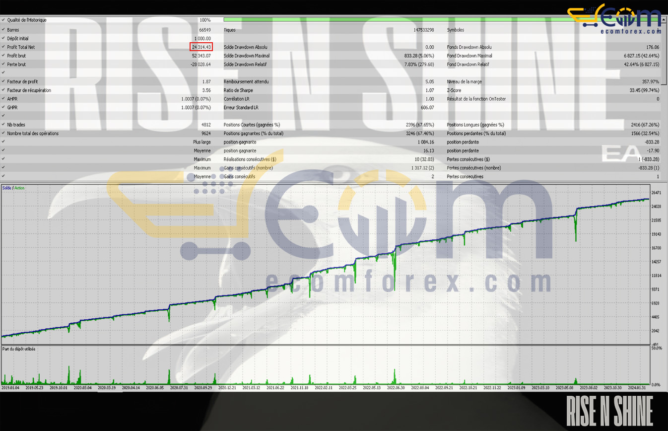 Rise N Shine EA MT5 delivered impressive long-term profitability over a multi-year backtest (approximately 2019–2024) on a single symbol, showcasing steady equity growth with disciplined algorithmic logic, dynamic position sizing, and effective trailing mechanisms even through volatile periods.